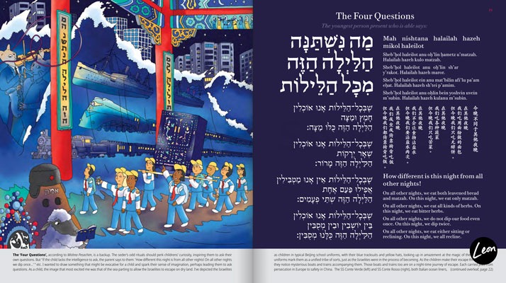 In addition to the book, Leon has created an 80x80cm artwork that contains the entirety of the Beijing Haggadah. Possibly the first of its kind. In most of his artworks, Leon habitually depicts the world as a series of collided memories and ideas rather than chronologically or geographically. This is very similar to how the traditional Haggadah tells the Exodus story. As such it was only natural to depict the Haggadah as a single, chaotic artwork. Seeing the Haggadah in this form is striking and surprisingly intuitive. Prints of this work are available for purchase.