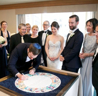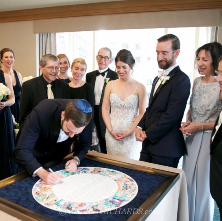 A beautiful Ketubah (analogous to wedding vows). Leon sits down with the couple and learns about their story, before turning it into an illustrated artwork. The text, in this case, is in three languages as the American couple met while living in Beijing.