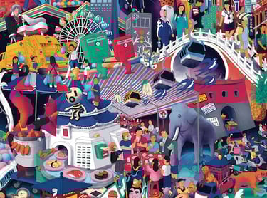 Leon's drawings are a new form of storytelling, depicting the world not chronologically or geographically, but rather as we remember it in dreams and imaginations: kaleidoscopes of interwoven memories, colliding together to form new stories and ideas. Leon’s work is complex and evocative and has been exhibited globally. To learn more about Leon, click here. To explore Leon's colliding worlds, click the images below.